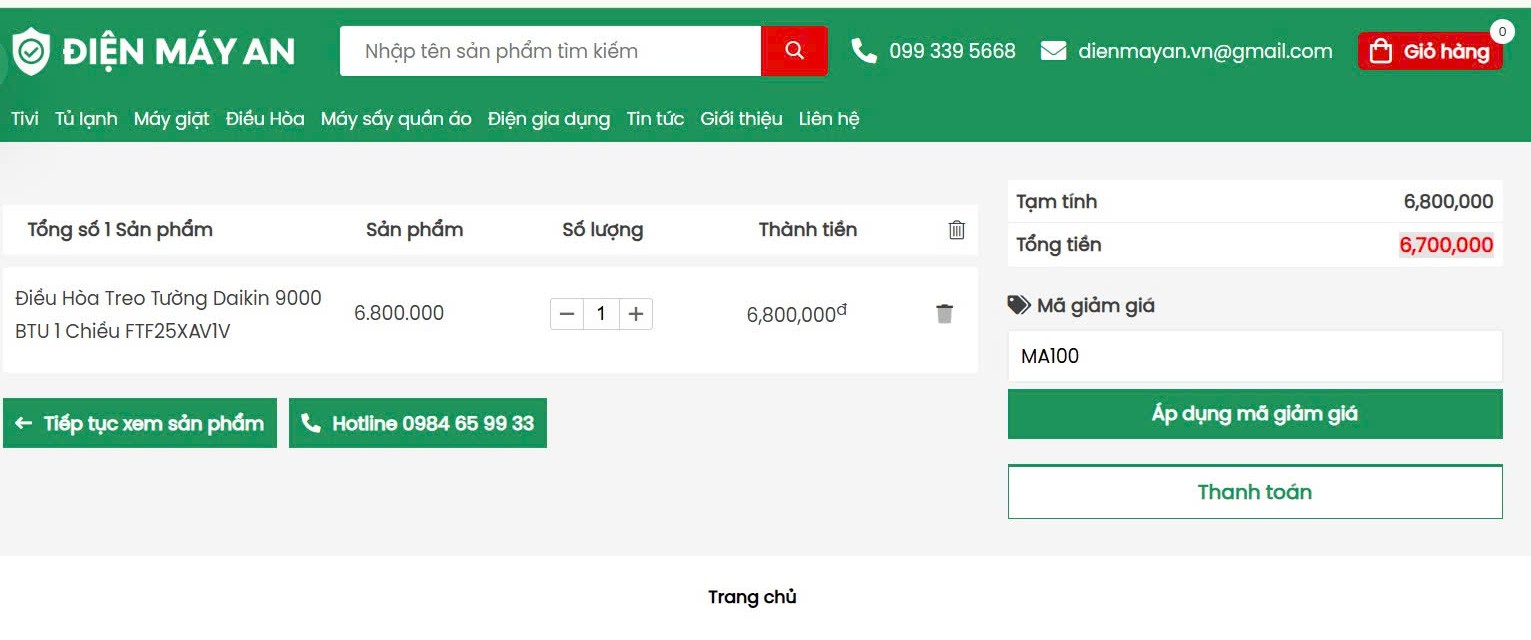 Khi mua hàng trực tiếp tại website dienmayan.vn, khách hàng chỉ cần nhập mã để nhận ngay ưu đãi: