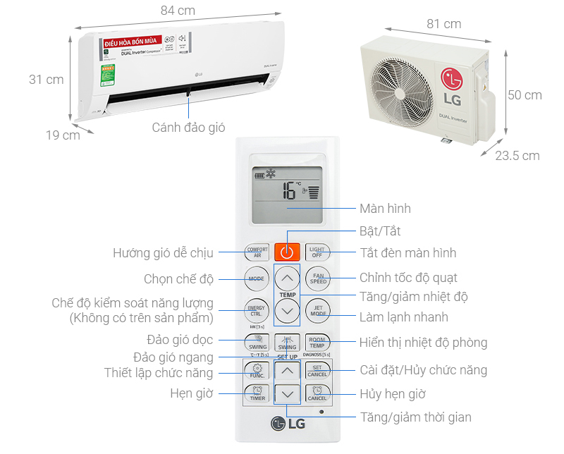 - Điều hòa LG cho phép tùy chỉnh hướng gió linh hoạt với chức năng điều khiển lên, xuống, trái, phải thông qua remote.