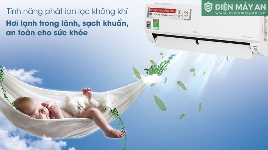 Điều hòa LG Inverter 9000 BTU có hệ thống lọc khí Ionizer giúp loại bỏ vi khuẩn, bụi mịn, nấm mốc và các tác nhân gây mùi khó chịu, từ đó mang đến không khí trong lành, an toàn cho sức khỏe của bạn và người thân.