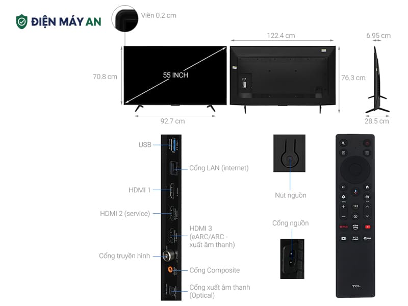 - Kích thước 55 inch từ chiếc Google Tivi QLED TCL AI 4K mang đến trải nghiệm hình ảnh rộng lớn, giúp người dùng đắm chìm trong từng khung hình với chất lượng sống động và chân thực.
