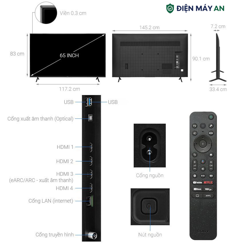 - Với màn hình rộng 65 inch và thiết kế viền siêu mỏng, tivi Sony thu hút mọi ánh nhìn, tạo cảm giác hoàn toàn sâu lắng khi người xem thưởng thức từng khung hình.
