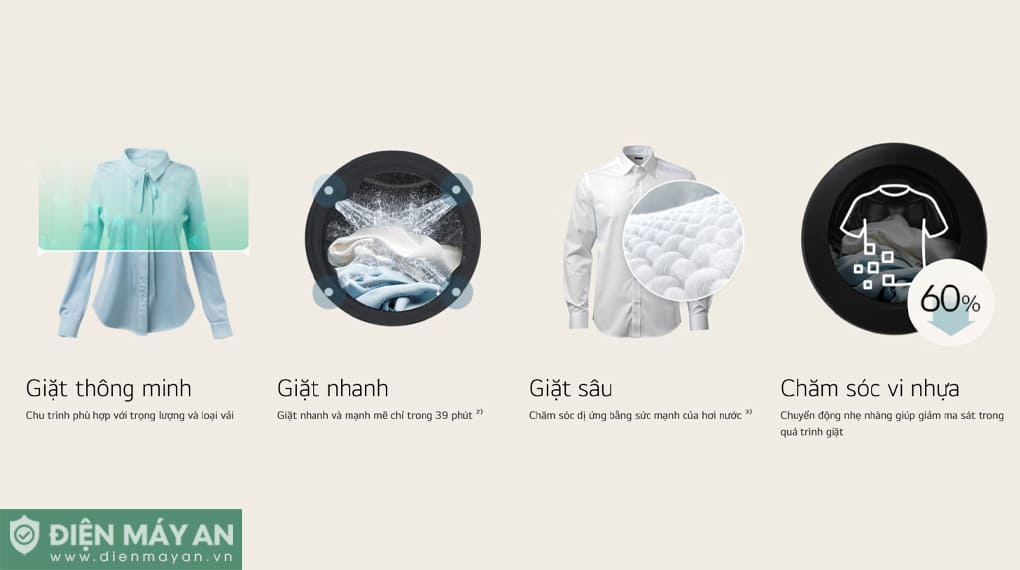 - Ngoài ra, công nghệ giặt hơi nước Steam giúp loại bỏ đến 99.9% vi khuẩn và tác nhân gây dị ứng, đồng thời làm mềm sợi vải, an toàn cho da nhạy cảm, đặc biệt là da trẻ nhỏ.
