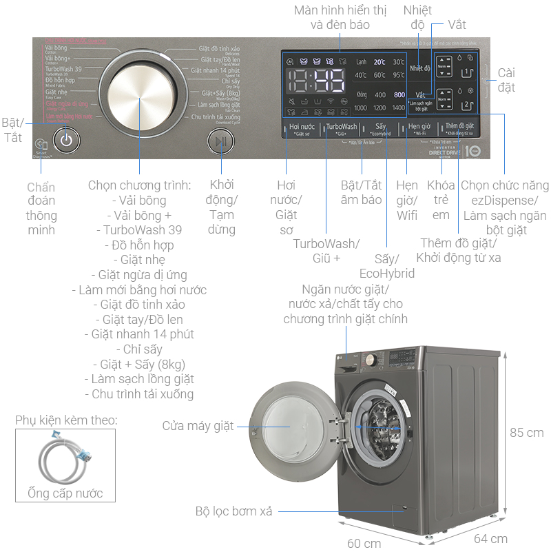 - Kết nối LG ThinQ: Cho phép điều khiển từ xa qua điện thoại hoặc giọng nói, dễ dàng giám sát và lên lịch giặt mọi lúc, mọi nơi.
