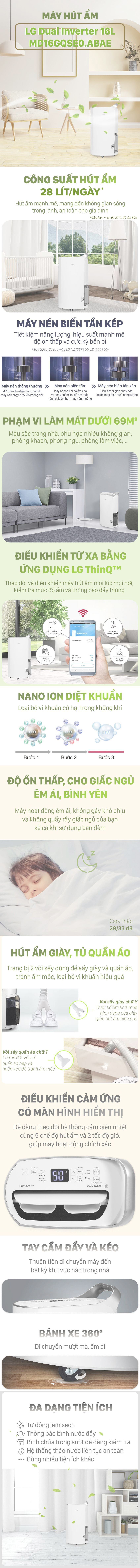 Có thể thấy, máy hút ẩm LG Dual Inverter 16L MD16GQSE0.ABAE hoạt động hiệu quả với công suất hút ẩm cao phù hợp cho không gian dưới 69m2 với nhiều tiện ích đi kèm như hút ẩm cho giày, điều khiển qua ứng dụng, tự điều chỉnh cường độ hút ẩm,... là lựa chọn đáng cân nhắc cho bạn và gia đình khi thời tiết vào nồm, ẩm ướt.