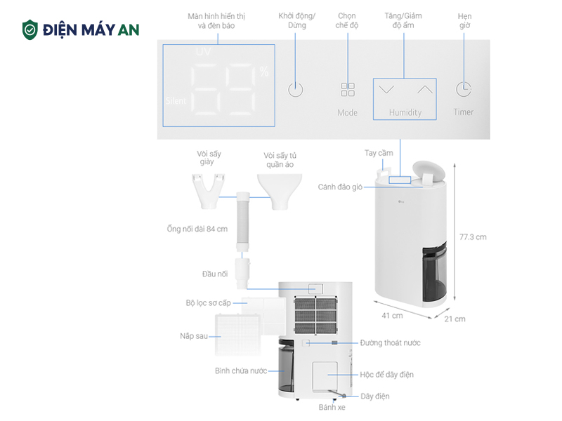 Máy đạt công suất hút ẩm lên đến 40 lít/ngày (ở điều kiện 30°C/80%RH), dễ dàng xử lý độ ẩm trong không gian rộng đến 99 m². Đây là lựa chọn lý tưởng cho phòng khách, căn hộ diện tích lớn, văn phòng hoặc các khu vực thường xuyên bị ẩm thấp.