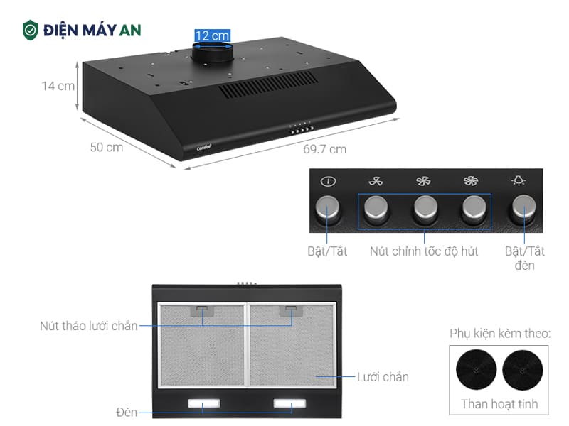 Đèn LED chiếu sáng hỗ trợ quan sát món ăn rõ ràng hơn khi nấu nướng. Bộ lọc than hoạt tính giúp khử mùi hiệu quả, nên thay định kỳ 6 - 12 tháng (tần suất cao nên thay sau 3 tháng). Lưới lọc nhôm nhẹ, dễ tháo rời và vệ sinh, hạn chế dầu mỡ bám vào động cơ, tăng độ bền cho máy.