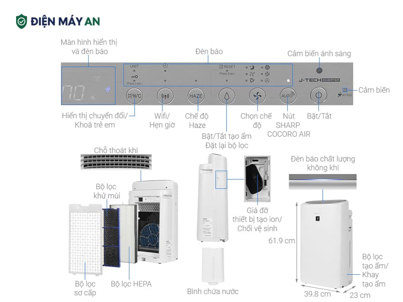 Máy lọc không khí và tạo ẩm ứng dụng công nghệ Plasmacluster Ion – công nghệ nổi bật giúp tạo ion âm và dương để vô hiệu hóa vi khuẩn, virus và mùi khó chịu, đồng thời tăng cường khả năng giữ ẩm cho không khí.