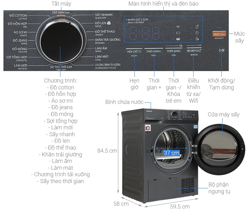 Kích thước 85 x 59,5 x 60 cm và khối lượng khoảng 45 kg phù hợp căn hộ hiện đại; máy có thể đặt cạnh hoặc lắp chồng với máy giặt Toshiba (khi dùng bộ kết nối tương thích) để tiết kiệm diện tích.