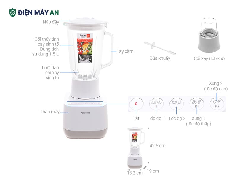 - Máy xay sinh tố đa năng Panasonic được trang bị 2 tốc độ xay và 2 chế độ nhồi, hỗ trợ linh hoạt cho nhiều mục đích như xay sinh tố, xay đá, xay hạt hay nhồi thực phẩm cứng.- Bảng điều khiển dạng nút nhấn giúp thao tác cực kỳ đơn giản, phù hợp cho mọi đối tượng sử dụng.