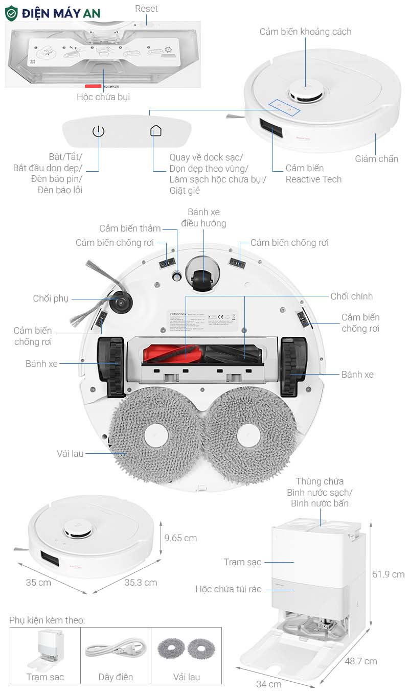 - Trạm sạc thông minh: tự động đổ bụi, giặt khăn lau và sấy khô, giữ giẻ lau sạch sẽ, khử mùi hôi.