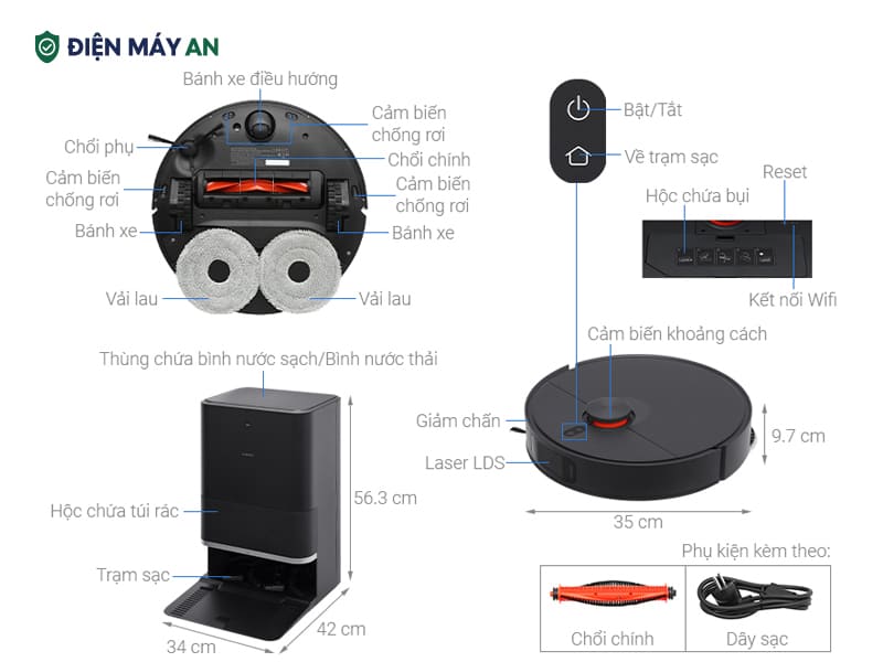 Robot hút bụi lau nhà kết nối với trạm sạc có túi chứa bụi lên đến 2500 ml, tự động chuyển rác từ robot sang trạm sau mỗi lần làm sạch, giúp giảm tần suất đổ rác thủ công.