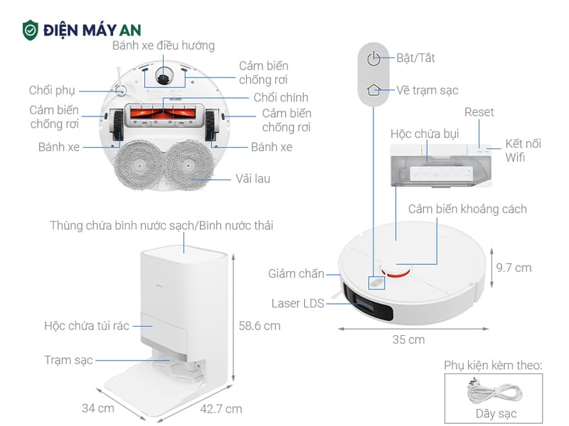 Dung tích hộp bụi 350 ml trên Robot hút bụi lau nhà Xiaomi đủ lớn cho một chu trình dọn dẹp hoàn chỉnh. Đặc biệt, trạm sạc thông minh có khả năng tự động hút bụi vào túi rác chỉ trong khoảng 10 giây, với túi chứa 2,5 lít, giúp giảm đáng kể số lần đổ bụi thủ công.