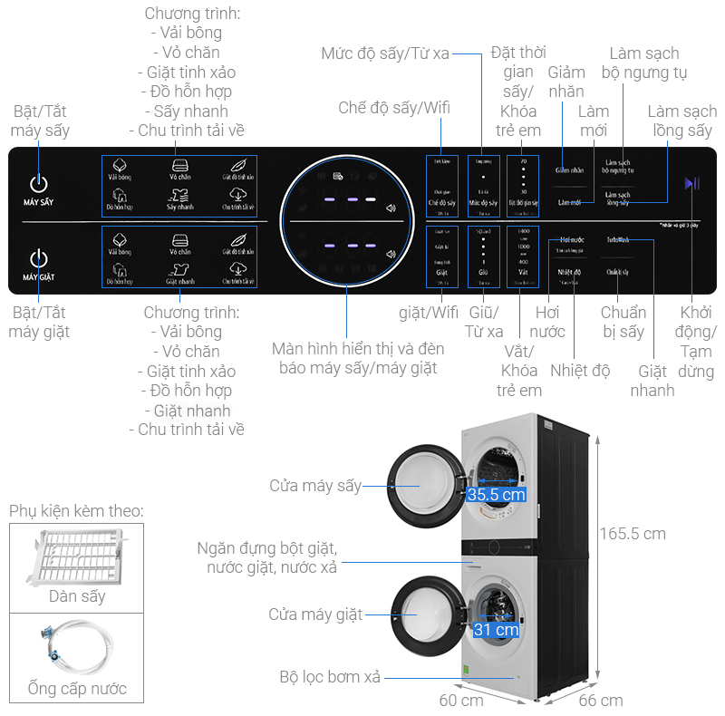 Tháp giặt sấy LG WashTower WT1410NHE mang dáng tủ đứng cửa ngang phủ sơn tĩnh điện đen thanh lịch, phù hợp đặt tại ban công, phòng giặt hoặc góc bếp. Bảng cảm ứng tiếng Việt nằm ngay giữa thân máy giúp thao tác cả phần giặt và sấy chỉ trên một màn hình LED rõ nét. Lồng thép không gỉ đục lỗ siêu nhỏ bảo vệ sợi vải, trong khi nắp kính cường lực trong suốt đóng mở êm, hỗ trợ quan sát quần áo bên trong.