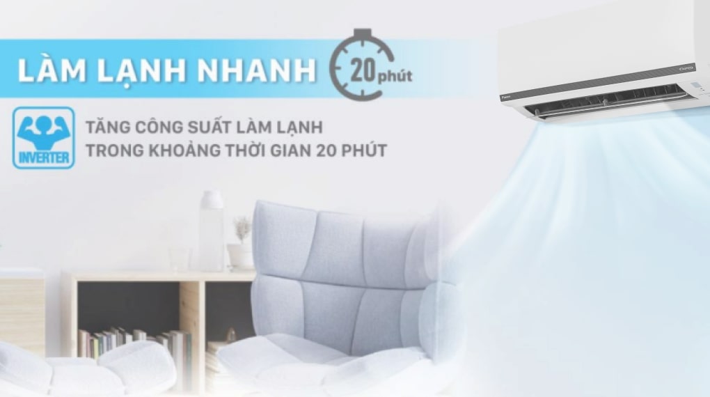 Công nghệ hiện đại này trên điều hòa Daikin Inverter 9000 BTU 1 chiều FTKB25WAVMV cho phép người dùng tận hưởng cảm giác thư giãn, mát lạnh nhanh chóng chỉ trong 20 phút, tiết kiệm thời gian khi sử dụng.