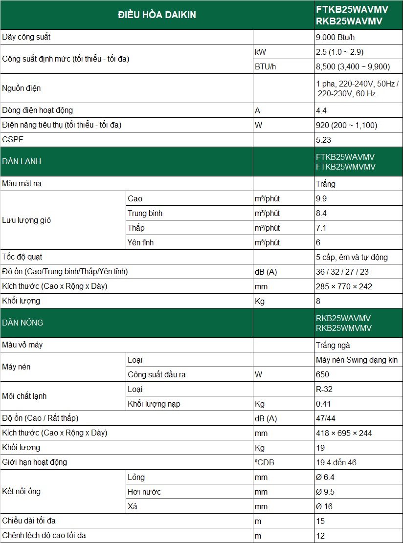 Với công suất 9000BTU, chiếc điều hòa Daikin Inverter 1 chiều FTKB25WAVMV này sẽ là lựa chọn rất lý tưởng cho những căn phòng có diện tích dưới 15m2 như phòng ngủ, phòng họp, phòng đọc sách,...