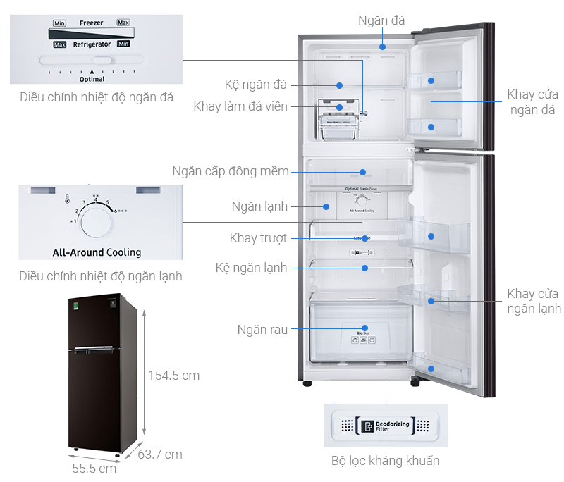 - Tủ lạnh Samsung Inverter RT22M4032BY/SV thuộc kiểu ngăn đá trên, với tông màu nâu được thiết kế với lớp sơn bóng giả gương sang trọng, tạo nên vẻ đẹp thẩm mỹ tinh tế trong không gian nhà bạn.